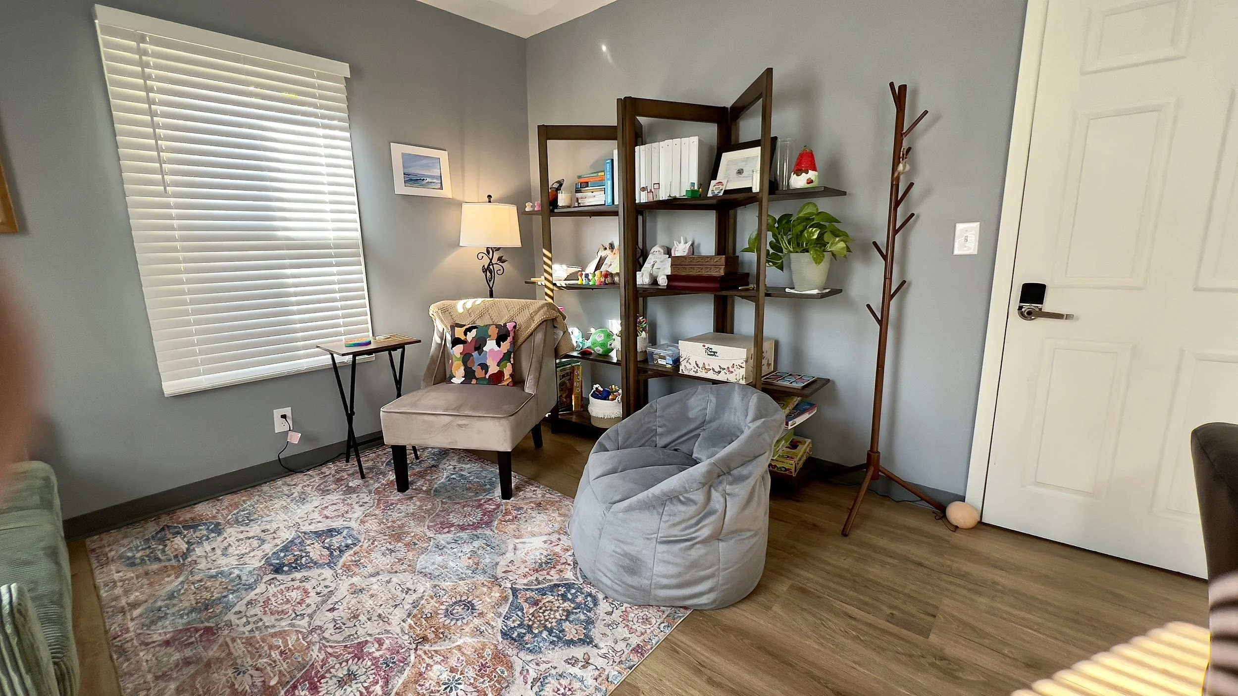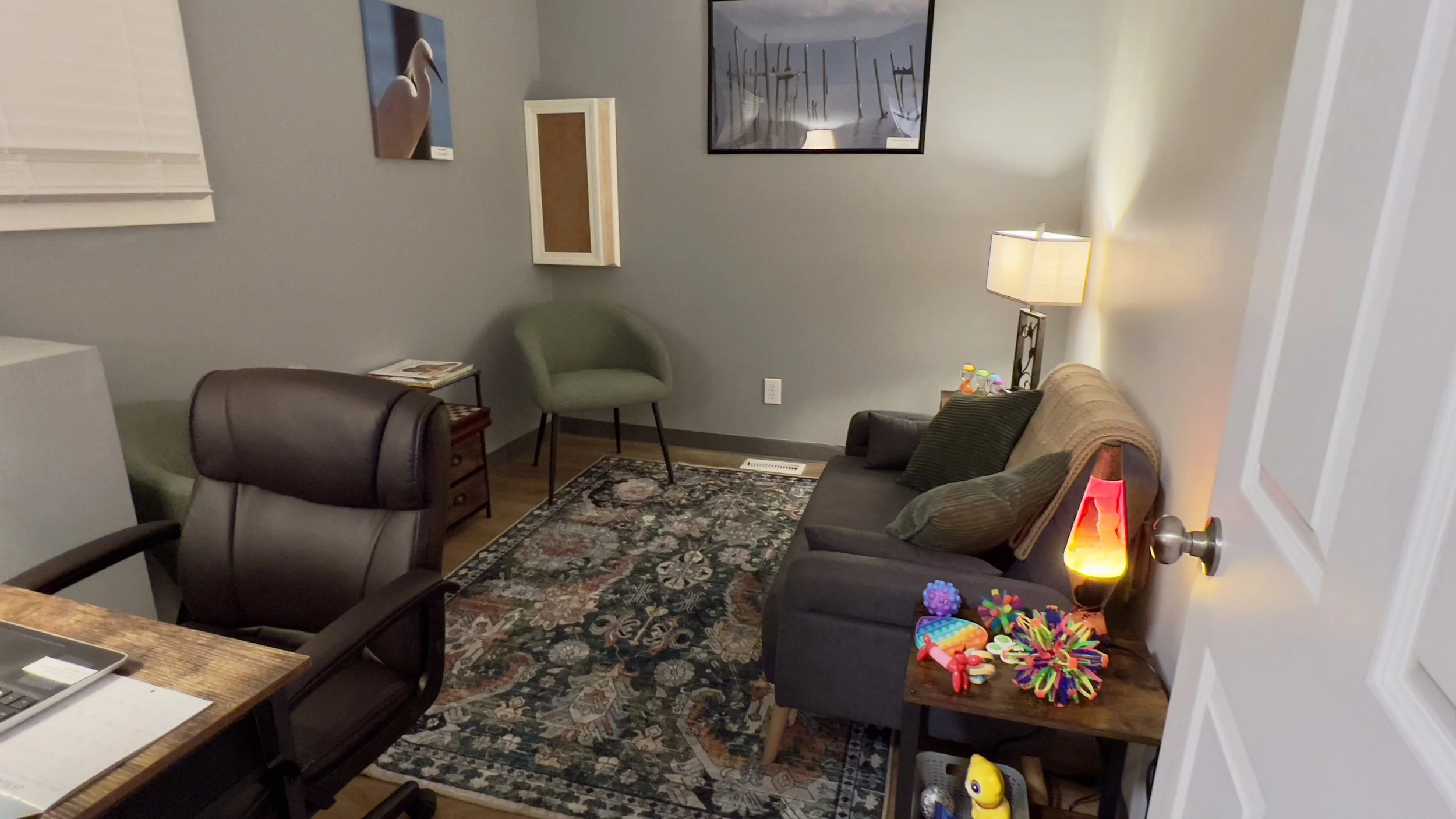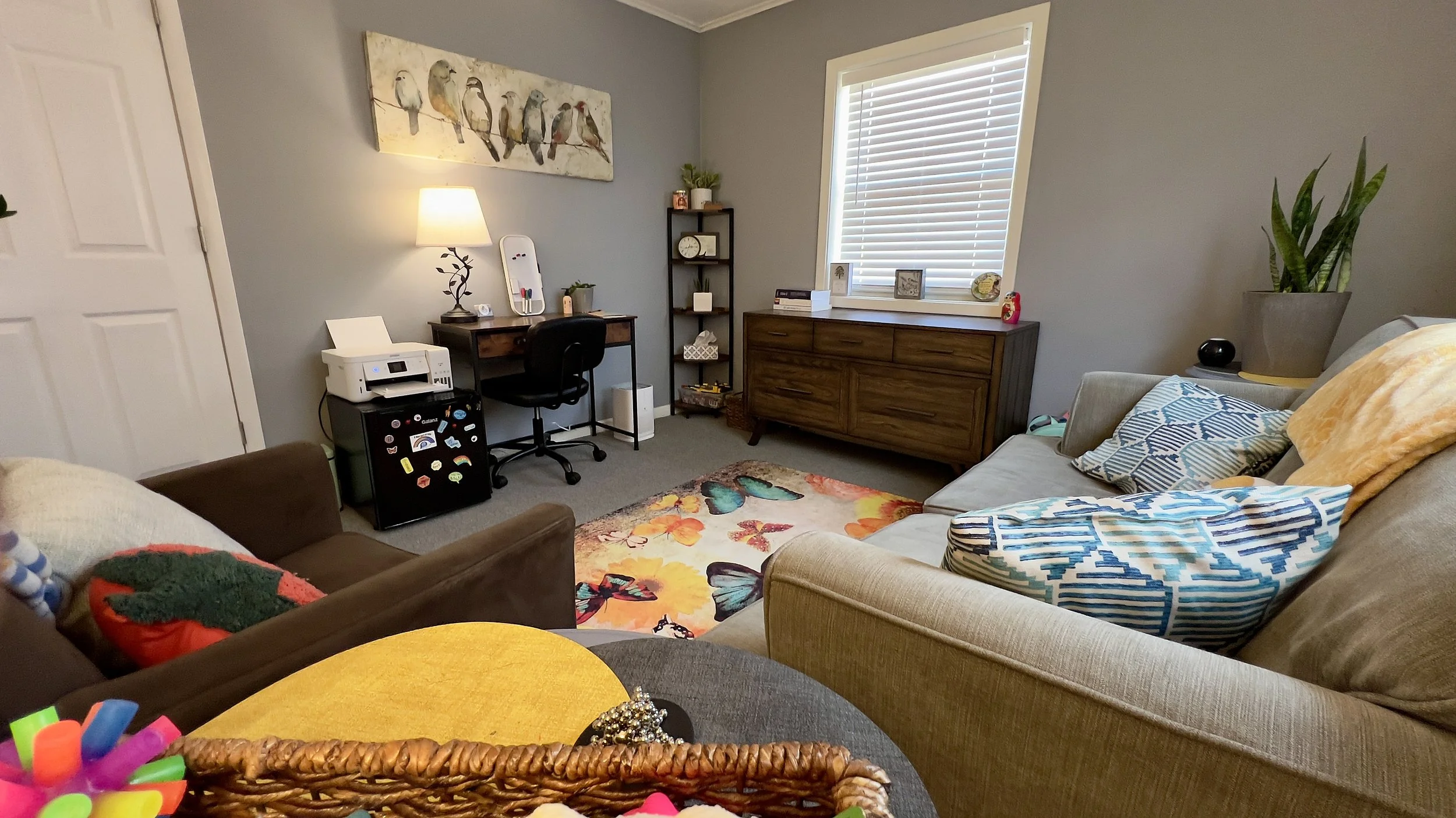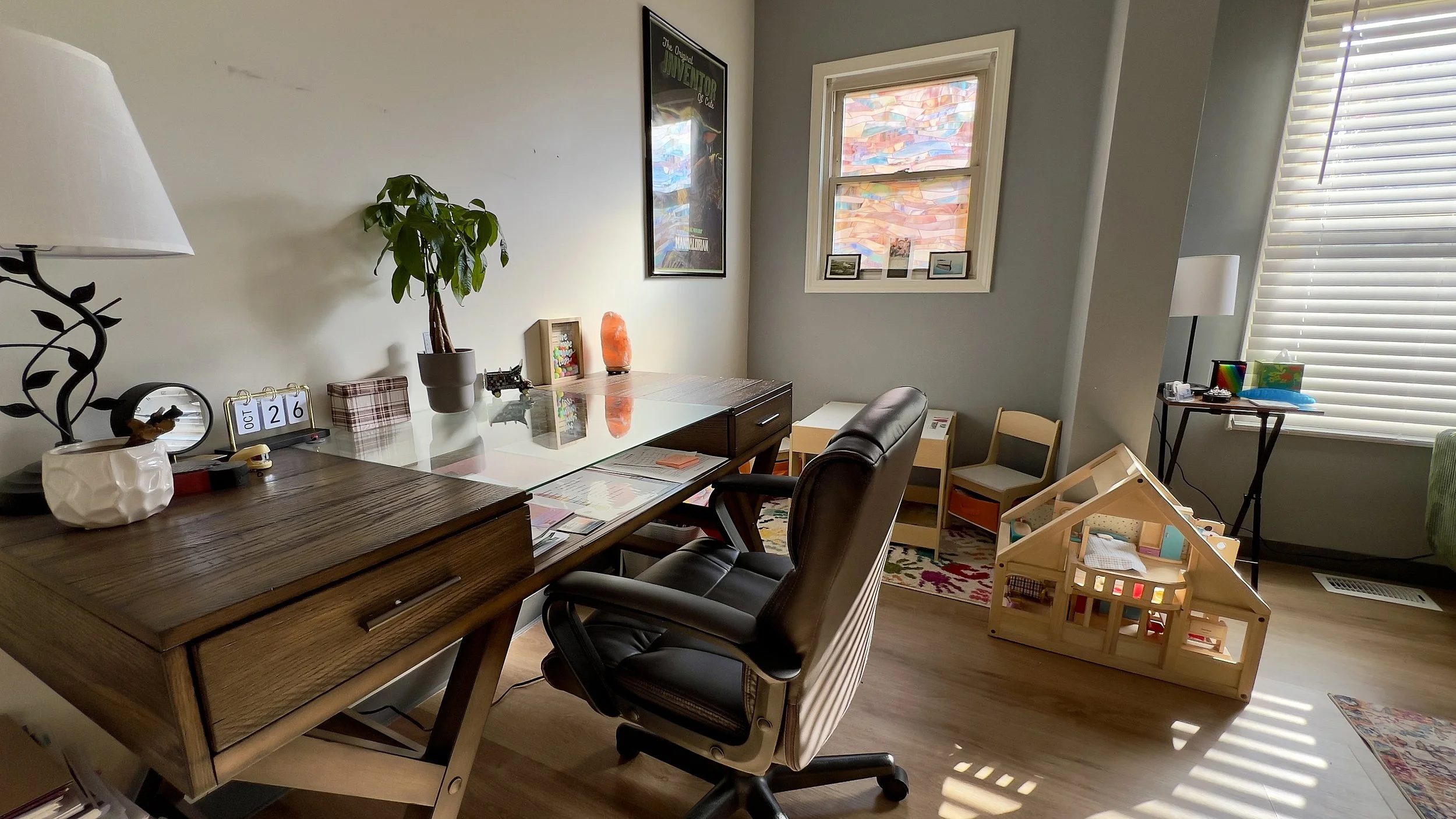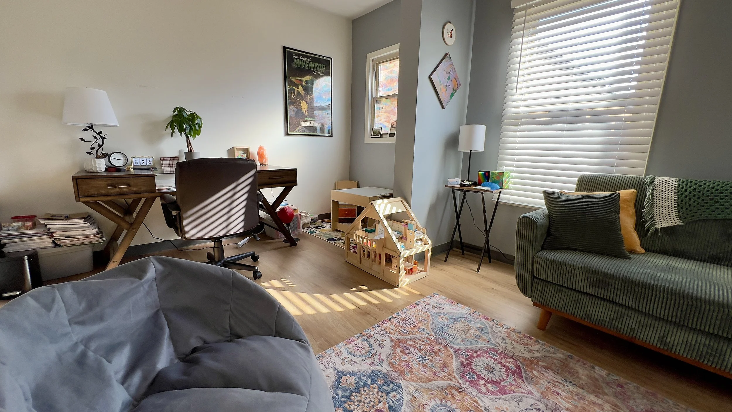 Office #1 is a bright and spacious room with plenty of natural light, creating a warm and inviting atmosphere. The comfortable furniture ensures a relaxing environment for our clients, while the thoughtful layout allows for easy movement and interaction. A dedicated play therapy area offers a creative space for children to explore and express themselves. This room is perfect for fostering connection, healing, and growth in a peaceful and supportive setting.