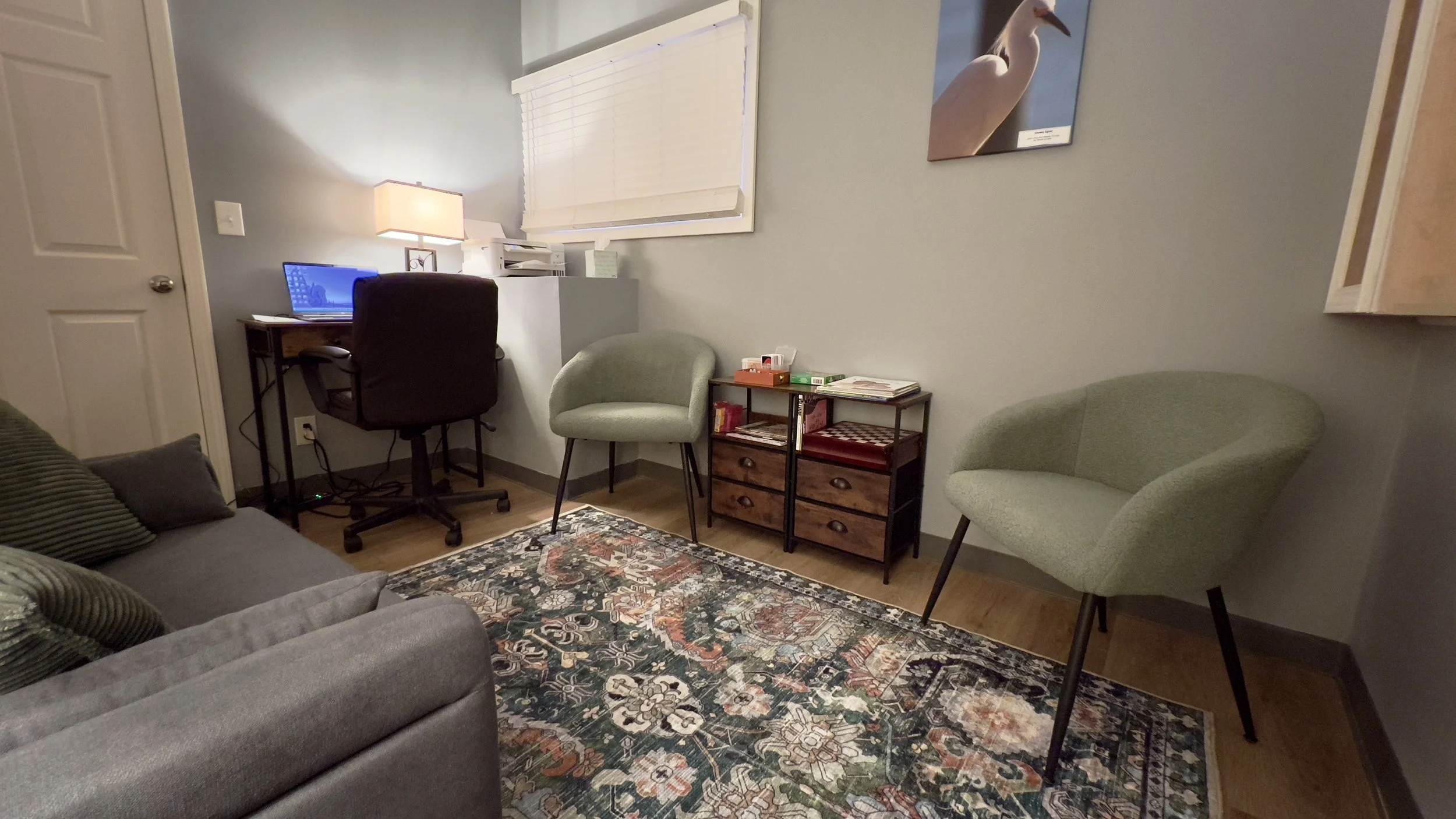Room #3 offers a quiet and intimate setting for sessions. It is furnished with comfortable seating to create a welcoming and supportive environment.